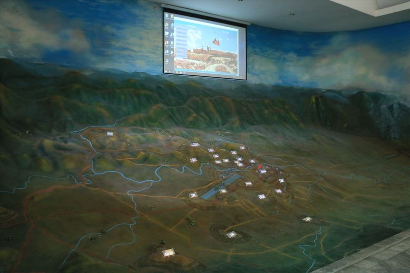 Bên trong bảo tàng, mô hình sa bàn chiến dịch Điện Biên Phủ được dựng lại với quy mô lớn, chi tiết tới từng trận địa, đồi, cứ điểm:
