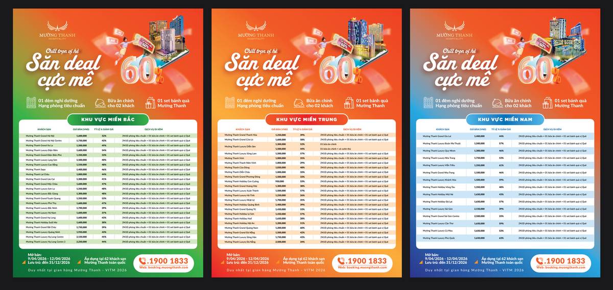 Chương trình ưu đãi tại VITM 2026 của Mường Thanh là cơ hội lý tưởng để lên kế hoạch cho những chuyến đi trong năm với chi phí hợp lý. Với mức giá từ 950.000đ cùng hệ thống khách sạn phủ rộng, đây chắc chắn là deal “đáng săn” cho bất kỳ ai yêu thích du lịch. Nếu bạn đang tìm kiếm một kỳ nghỉ vừa tiết kiệm vừa chất lượng, đừng bỏ lỡ gian hàng Mường Thanh tại VITM 2026.