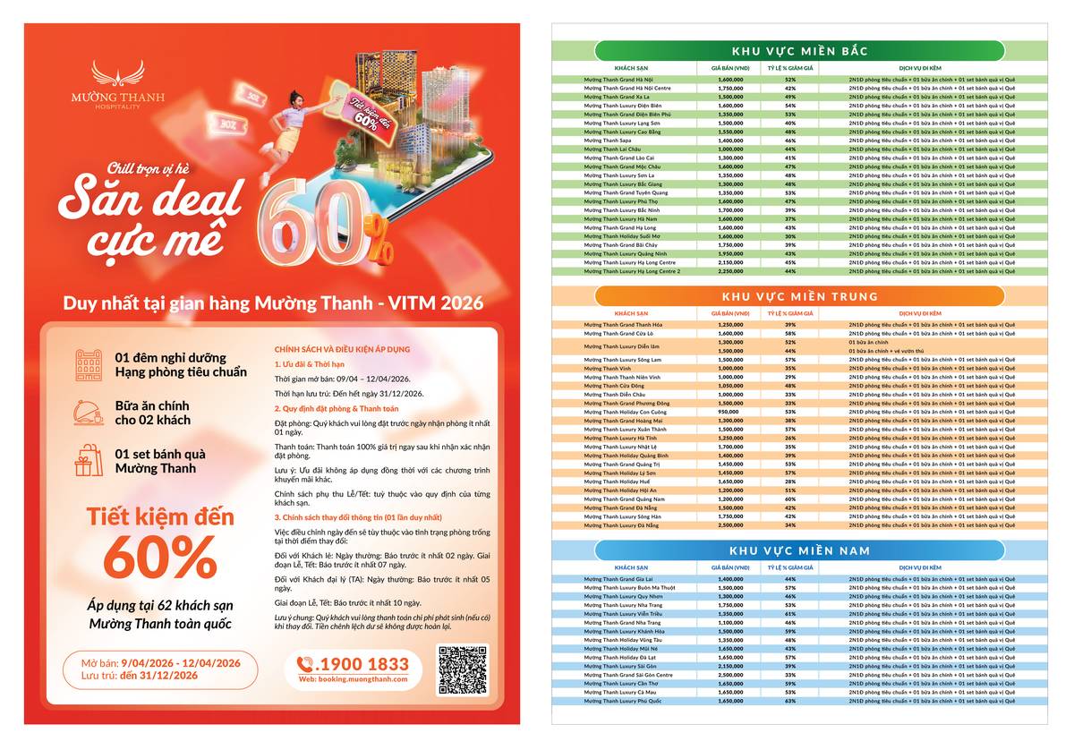 Tại VITM 2026, Mường Thanh mang đến chương trình ưu đãi quy mô lớn trên toàn hệ thống, với mức giá hấp dẫn chỉ từ 950.000đ cho kỳ nghỉ 2 ngày 1 đêm. Đây là cơ hội hiếm có để du khách sở hữu kỳ nghỉ chất lượng với chi phí tối ưu, đặc biệt trong mùa cao điểm du lịch sắp tới.
